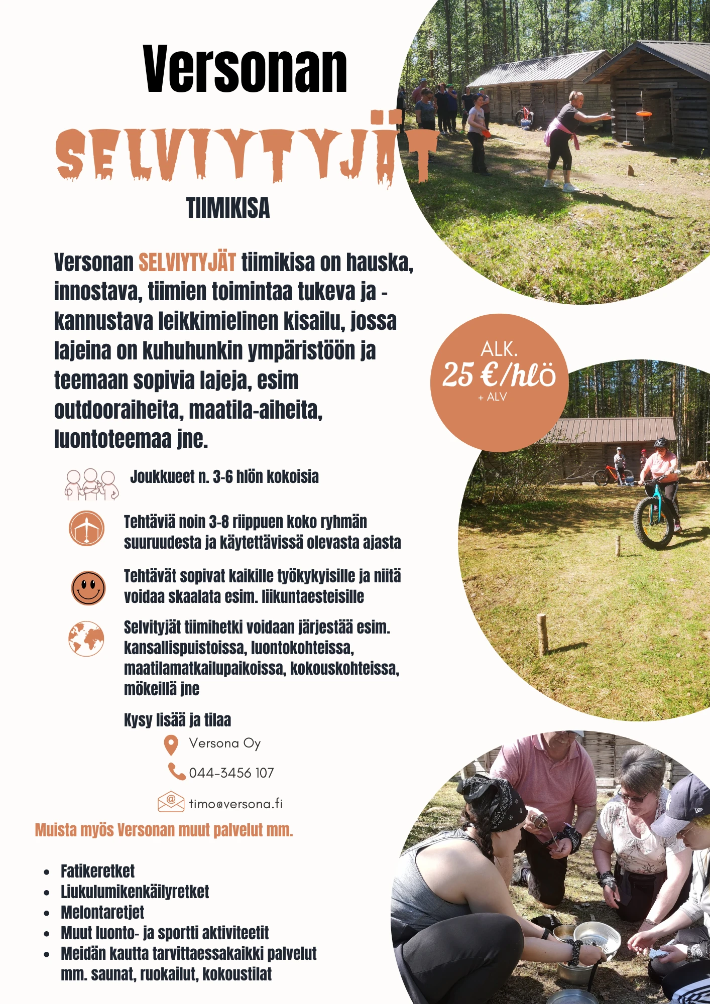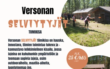 Versonan SELVIYTYJÄT tiimikisa on hauska, innostava, tiimien toimintaa tukeva ja kannustava leikkimielinen kisailu, jossa lajeina on kuhuhunkin ympäristöön ja teemaan sopivia lajeja, esim outdooraiheita, maatila-aiheita, luontoteemaa jne.